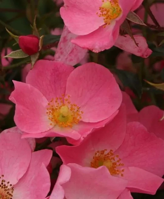 Virágai kisebb vagy közepes méretűek, egyszerű vagy félig telt szirmúak, rózsaszín árnyalatúak. A virágok általában kisebb fürtökben jelennek meg a hajtások végén. A fajta a tenyészidőszak során több hullámban virágzik. Lombozata sűrű, közép- vagy sötétzöld színű, amely jól takarja a talajt.
